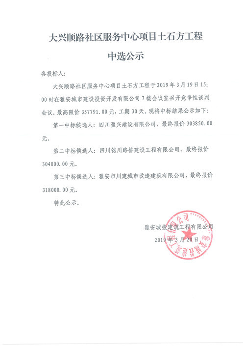 大興順路社區(qū)服務中心土方工程競爭性談判中選公示