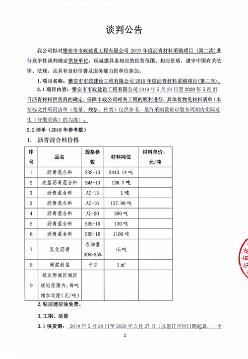 市政公司2019年度瀝青材料采購項目競爭性談判公告 (第二次)