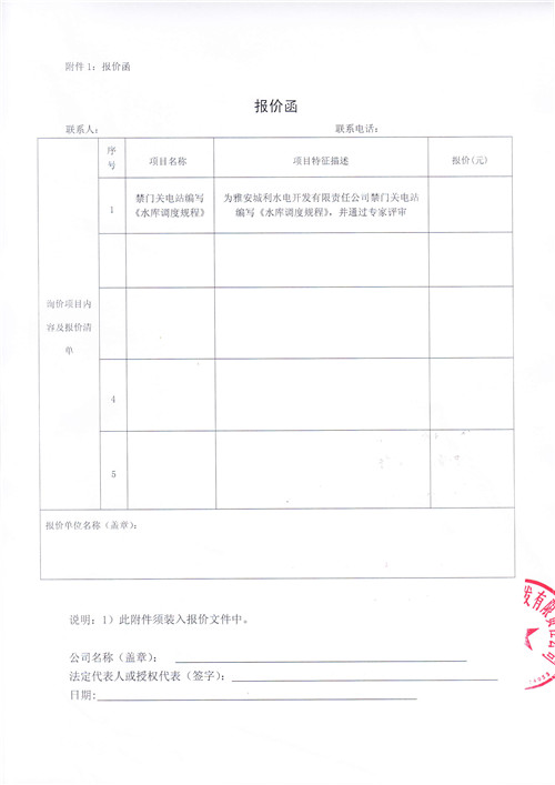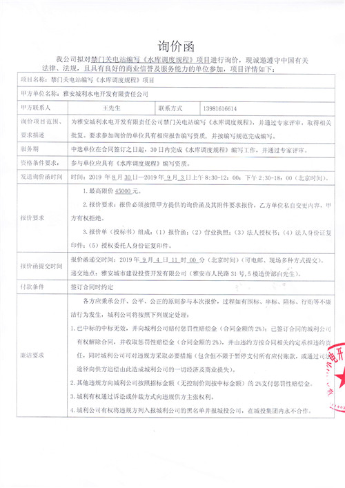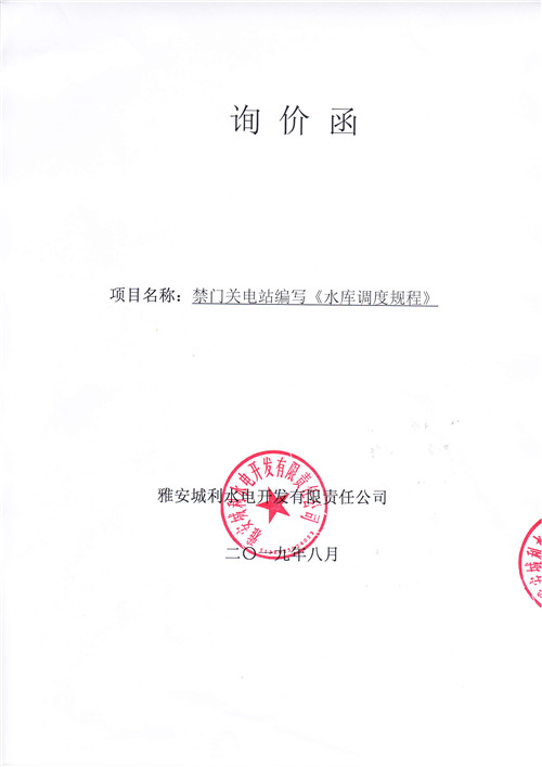 雅安城利水電開(kāi)發(fā)有限責(zé)任公司禁門關(guān)電站編寫(xiě)《水庫(kù)調(diào)度規(guī)程》競(jìng)爭(zhēng)性談判公告