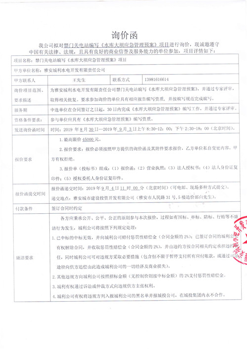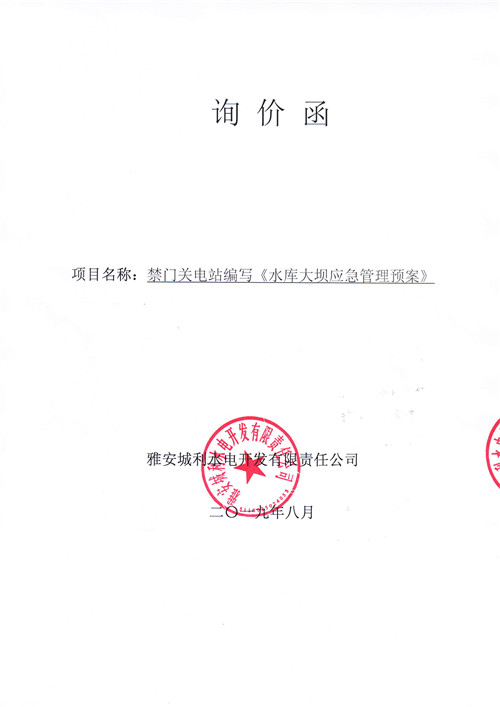 雅安城利水電開發(fā)有限責(zé)任公司禁門關(guān)電站編寫《水庫(kù)大壩應(yīng)急管理預(yù)案》競(jìng)爭(zhēng)性談判公告