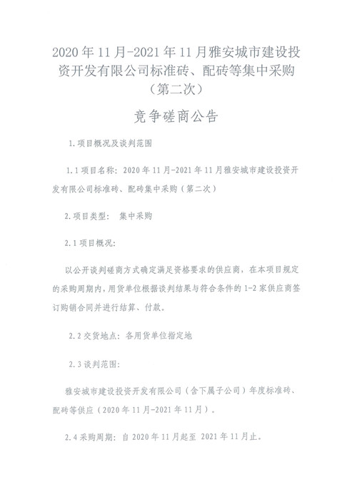 2020年11月-2021年11月雅安城市建設(shè)投資開發(fā)有限公司標(biāo)準(zhǔn)磚、配磚等集中采購(gòu)(第二次)競(jìng)爭(zhēng)磋商公告