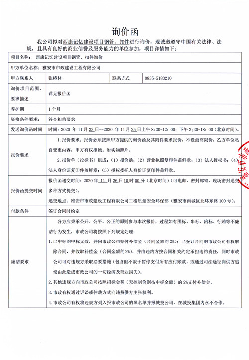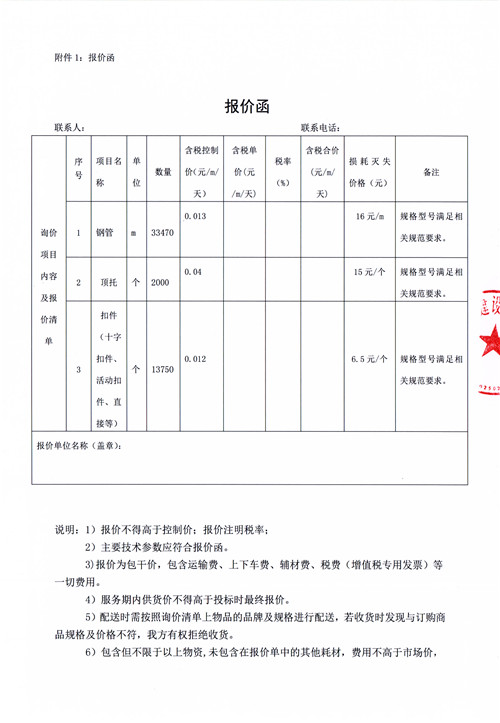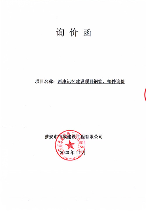 市政公司西康記憶建設(shè)項(xiàng)目鋼管、扣件詢(xún)價(jià)函
