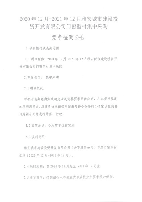 2020年12月-2021年12月雅安城市建設(shè)投資開(kāi)發(fā)有限公司門窗型材集中采購(gòu)競(jìng)爭(zhēng)磋商公告
