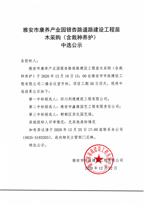 雅安市康養(yǎng)產業(yè)園銀杏路道路建設工程苗木采購(含栽種養(yǎng)護)中選公示