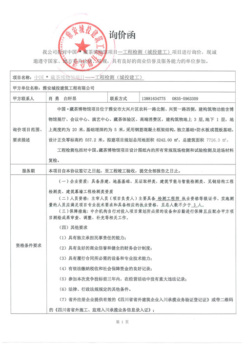 中國·藏茶博物館項(xiàng)目——工程檢測(城投建工)項(xiàng)目詢價(jià)函