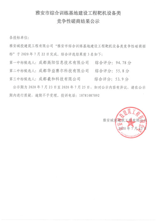 城投建工公司雅安市綜合訓(xùn)練基地建設(shè)工程靶機設(shè)備類競爭性磋商結(jié)果公示