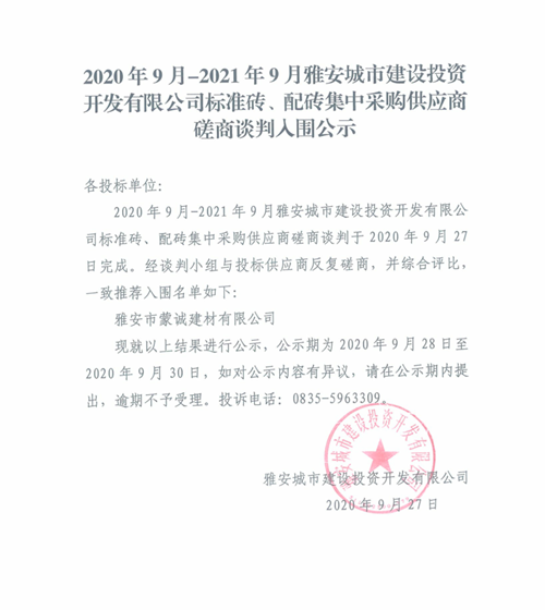 2020年9月-2021年9月雅安城市建設投資開發(fā)有限公司標準磚、配磚集中采購供應商磋商談判入圍公示