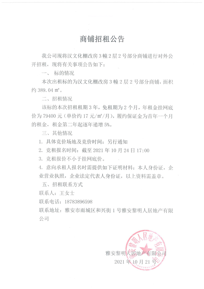 漢文化安置房3幢2層2號(hào)部分商鋪招租公告