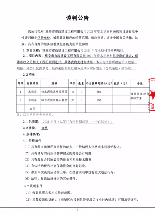 雅安市市政建設(shè)工程有限公司2021年度水穩(wěn)材料采購項(xiàng)目