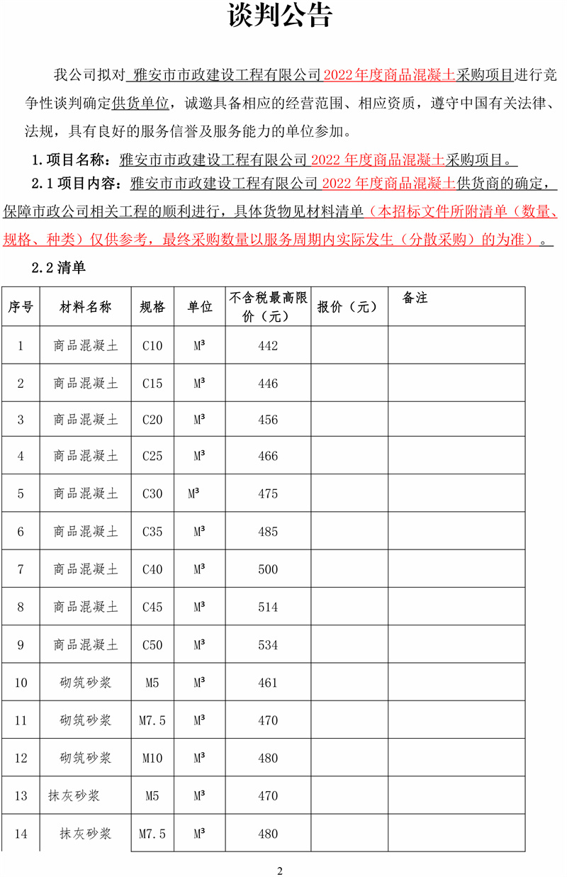 雅安市市政建設(shè)工程有限公司2022年度商品混凝土采購項目競爭性談判公告