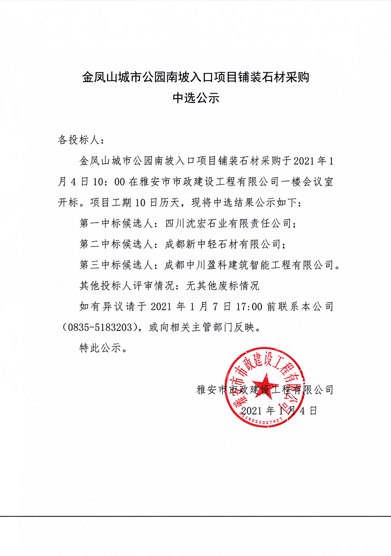 金鳳山城市公園南坡入口項(xiàng)目鋪裝石材采購中選公示