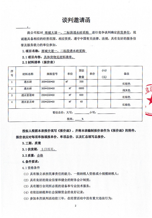 市政公司雨城大道一、二標(biāo)段透水磚采購競(jìng)爭(zhēng)性談判公告