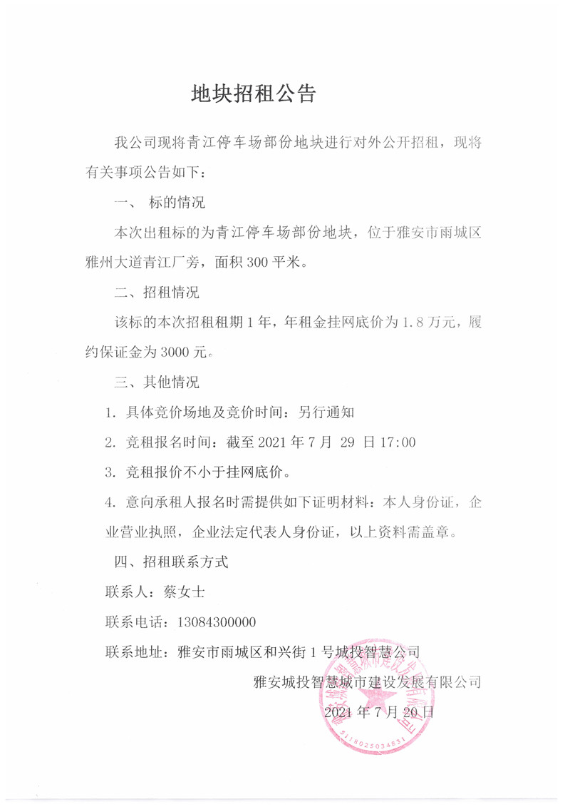 城投智慧公司青江停車場部分地塊招租公告(300㎡)