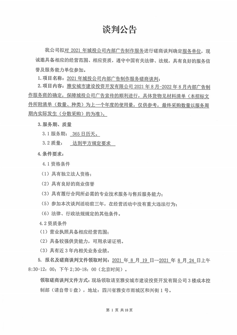 2021年城投公司內(nèi)部廣告制作服務磋商談判公告