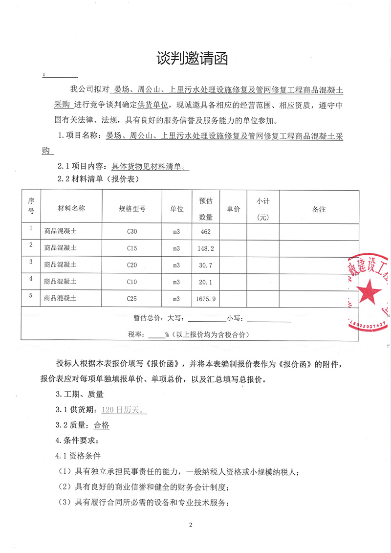 晏場、周公山、上里污水處理設施修復及管網修復工程商品混凝土采購競爭性談判公告