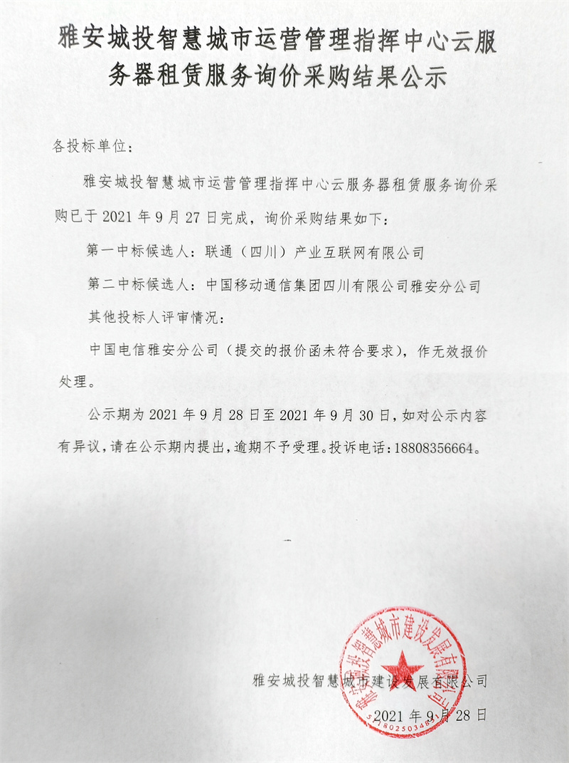 雅安城投智慧城市運(yùn)營(yíng)管理指揮中心云服務(wù)器租賃服務(wù)采購(gòu)詢(xún)價(jià)結(jié)果公示