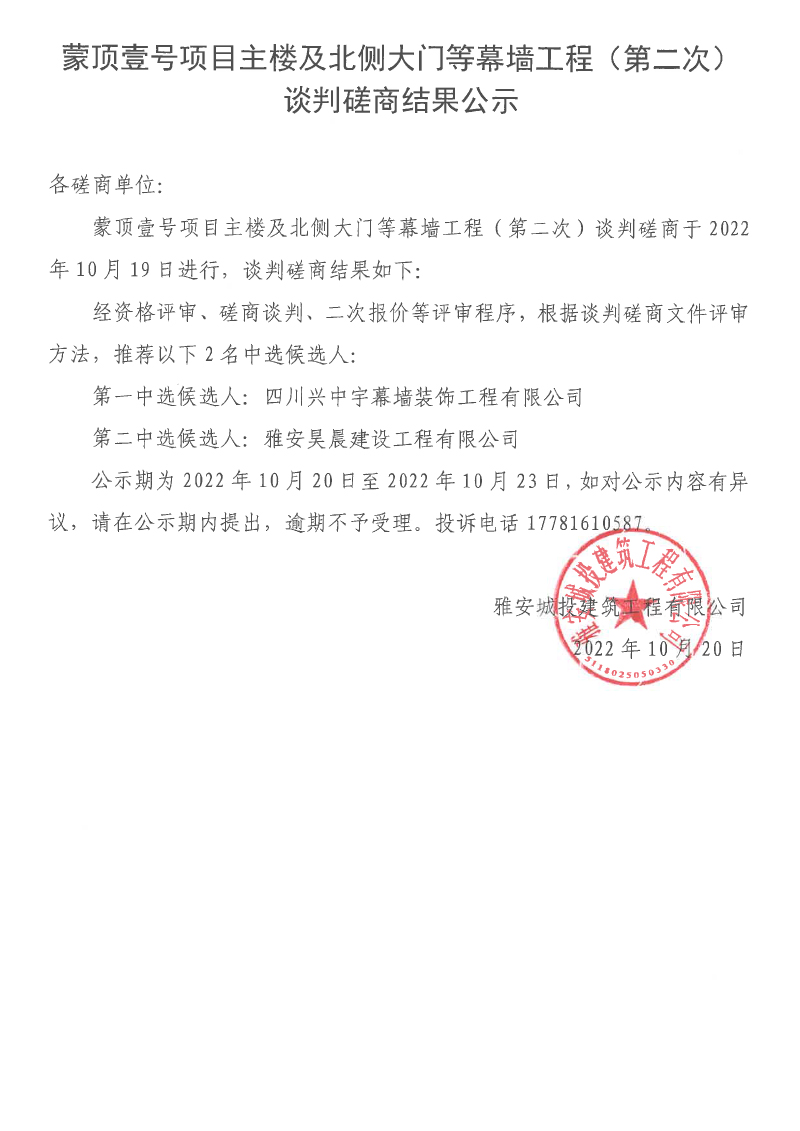 蒙頂壹號(hào)項(xiàng)目主樓及北側(cè)大門等幕墻工程(第二次)談判磋商結(jié)果公示