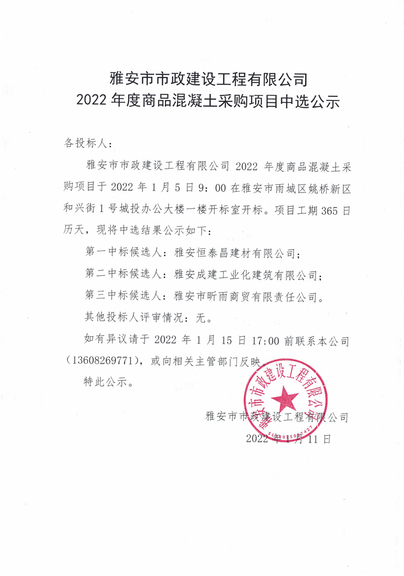 雅安市市政建設工程有限公司2022年度商品混凝土采購項目中選公示