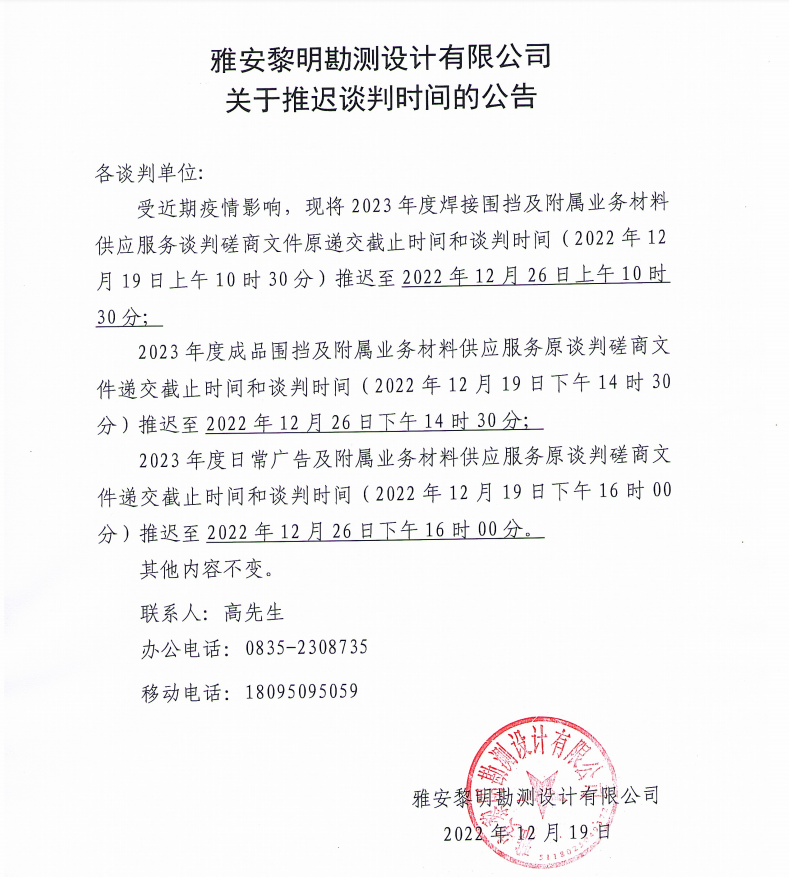 雅安黎明勘測設(shè)計(jì)有限公司關(guān)于推遲談判時(shí)間的公告