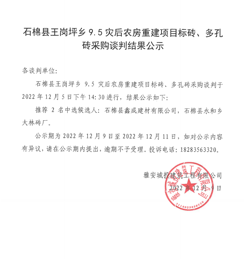 石棉縣王崗坪鄉(xiāng)9.5災后農(nóng)房重建項目標磚、多孔磚采購談判結(jié)果公示