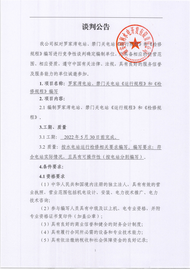 羅家灣電站、禁門關(guān)電站《運(yùn)行規(guī)程》和《檢修規(guī)程》編寫競爭性談判公告