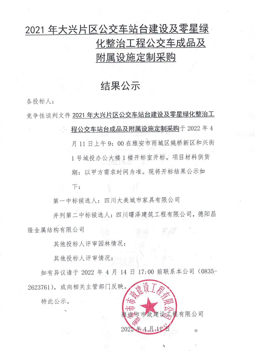 2021年大興片區(qū)公交站臺建設(shè)及零星綠地整治工程公交站臺成品及附屬設(shè)施定制采購結(jié)果公示