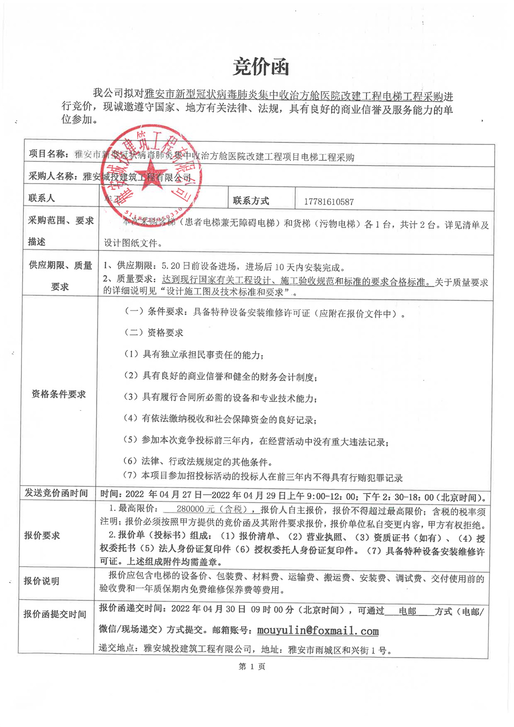 雅安市新型冠狀病毒肺炎集中收治方艙醫(yī)院改建工程項(xiàng)目電梯工程采購(gòu)競(jìng)價(jià)公告