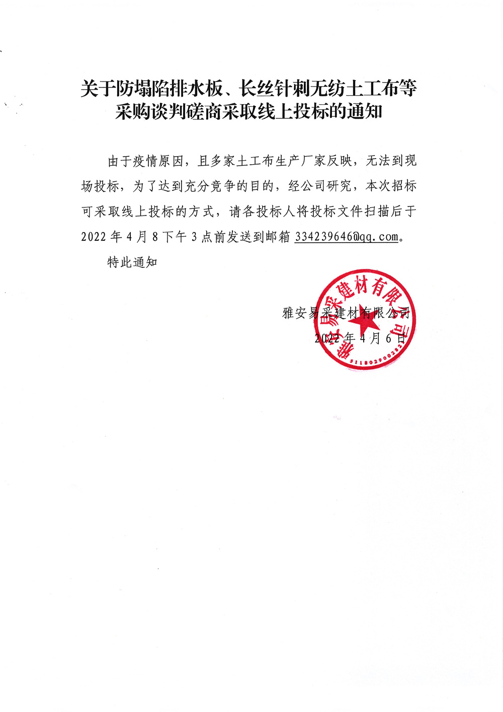 雅安易采建材有限公司防塌陷排水板、長絲針刺無紡?fù)凉げ嫉炔少徴勁写枭滩扇【上投標(biāo)的通知