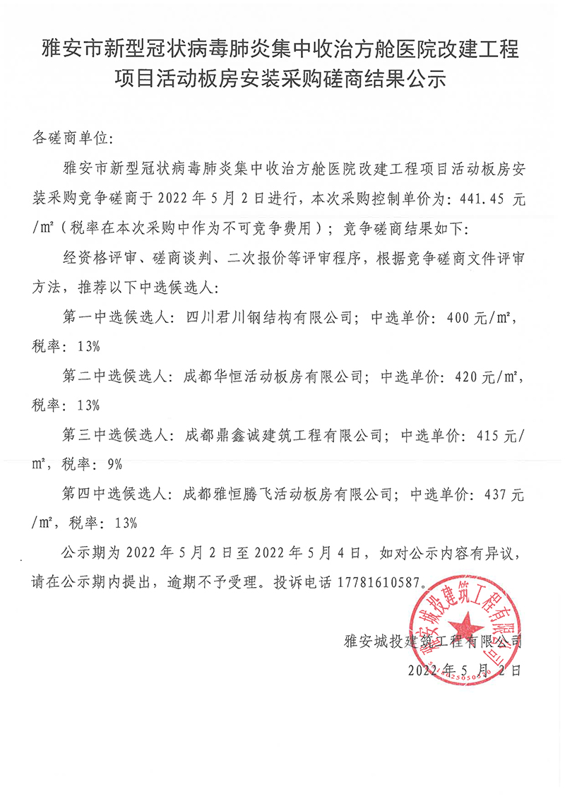 雅安市新型冠狀病毒肺炎集中收治方艙醫(yī)院改建工程項(xiàng)目活動(dòng)板房安裝采購(gòu)磋商結(jié)果公示