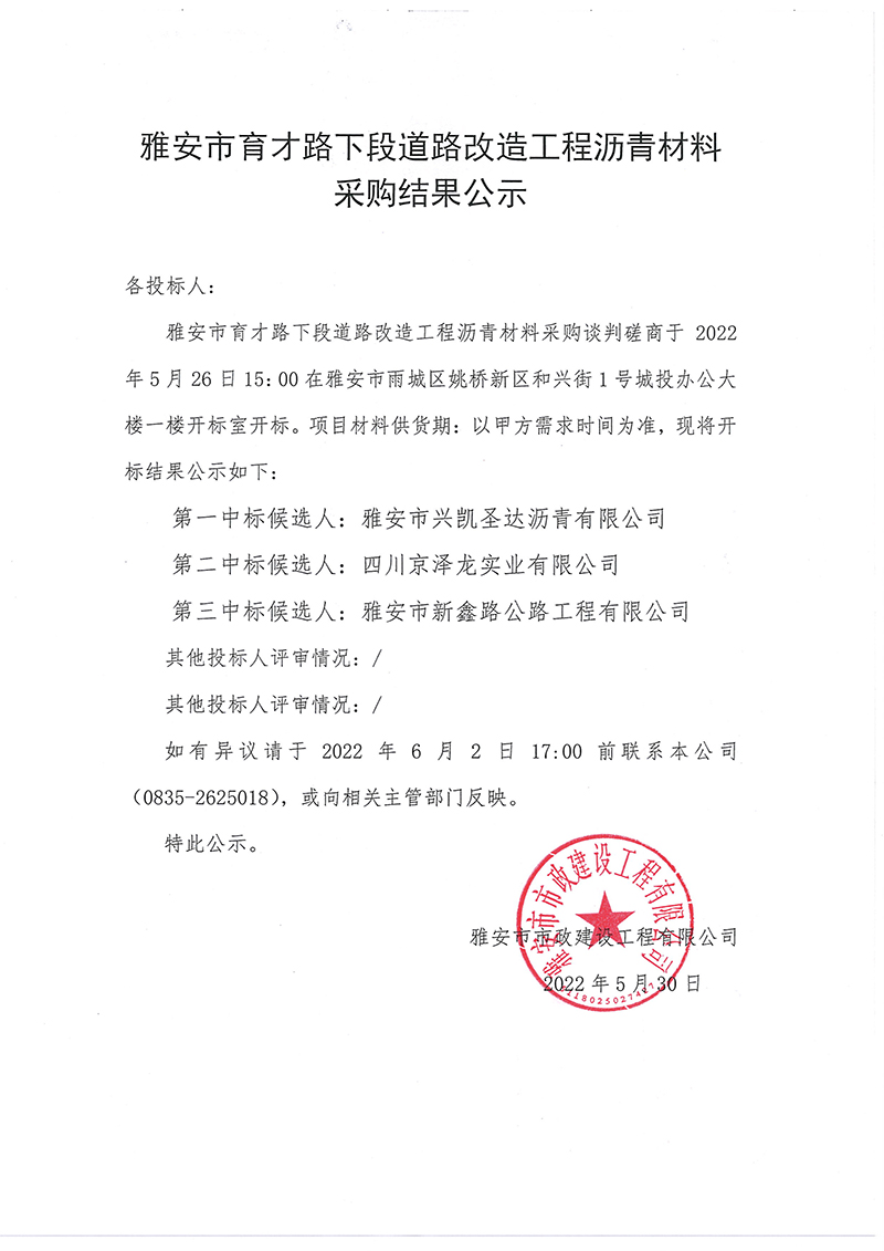 雅安市育才路下段道路改造工程瀝青材料采購(gòu)結(jié)果公示