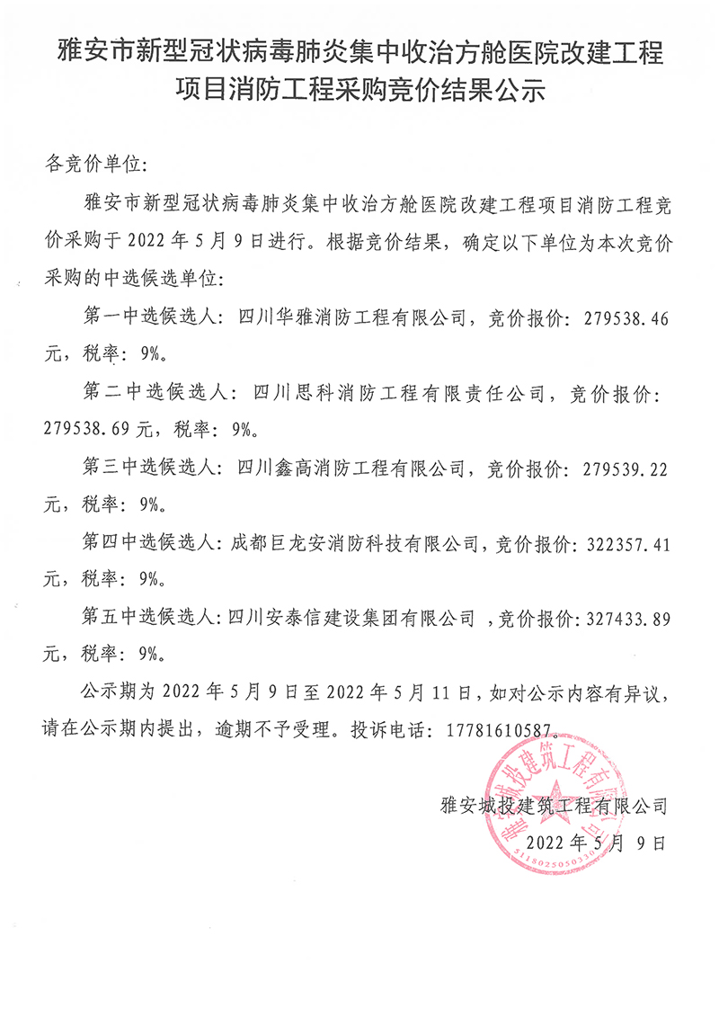 雅安市新型冠狀病毒肺炎集中收治方艙醫(yī)院改建工程項目消防工程采購競價結果公示