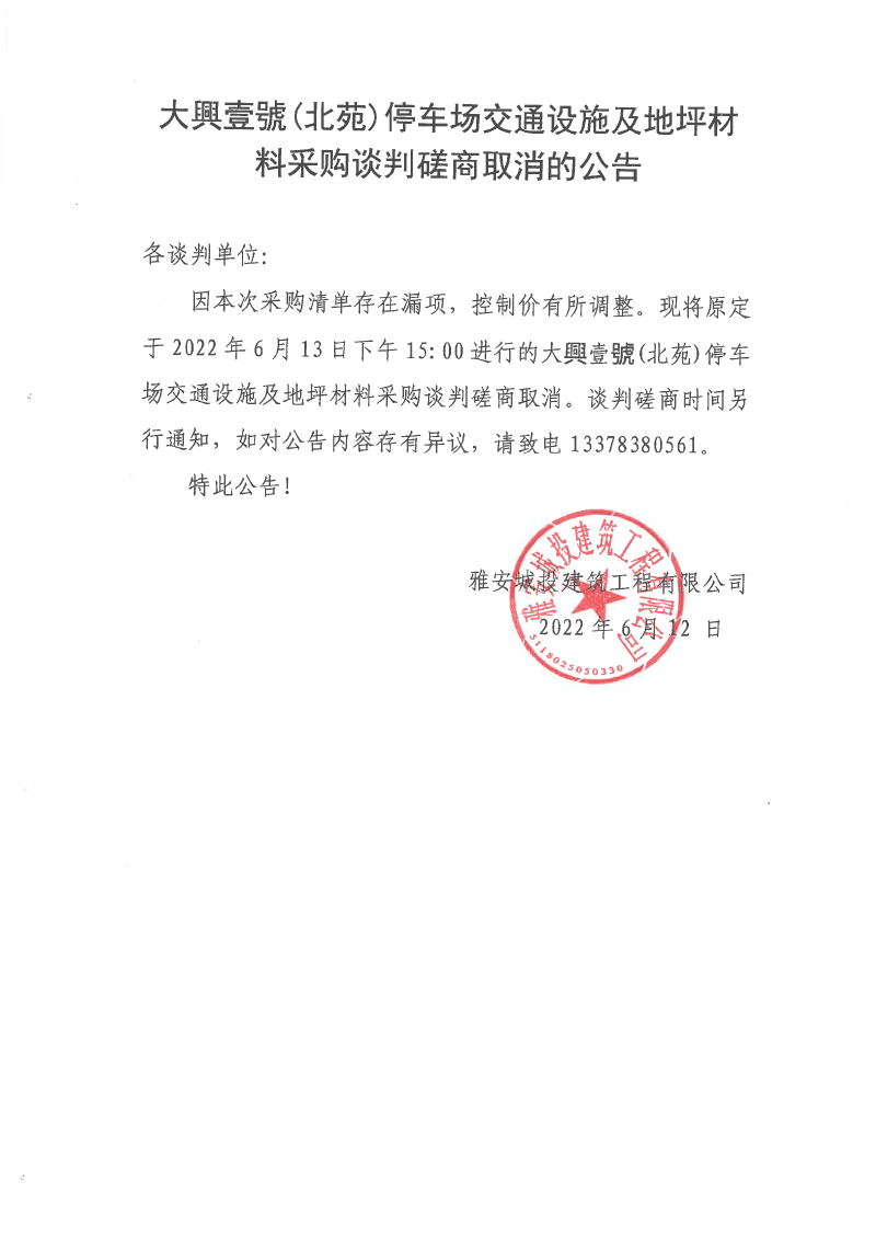 大興壹號(hào)(北苑)停車場(chǎng)交通設(shè)施及地坪材料采購(gòu)談判磋商取消的公告