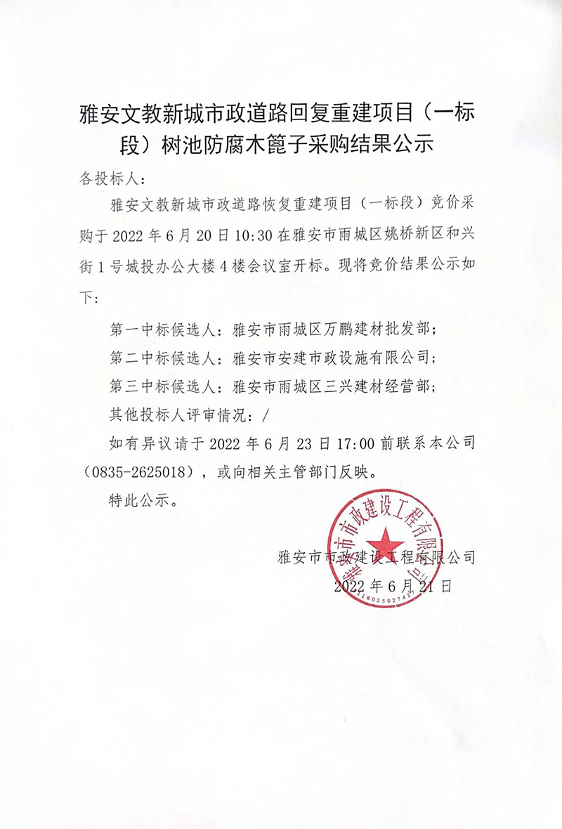 雅安市文教新城市政道路恢復(fù) 重建項(xiàng)目工程(一標(biāo)段)樹池防腐木篦子采購(gòu)結(jié)果公示