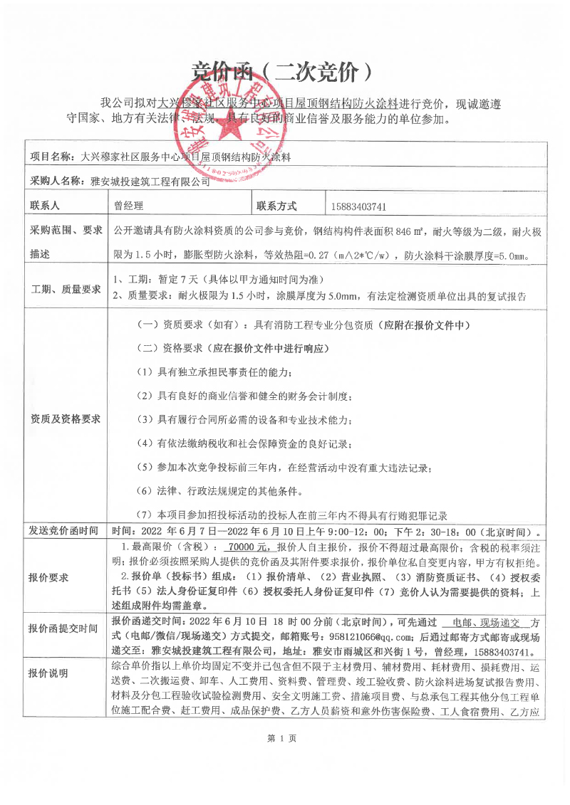 大興穆家社區(qū)服務(wù)中心項目屋頂鋼結(jié)構(gòu)防火涂料競價公告