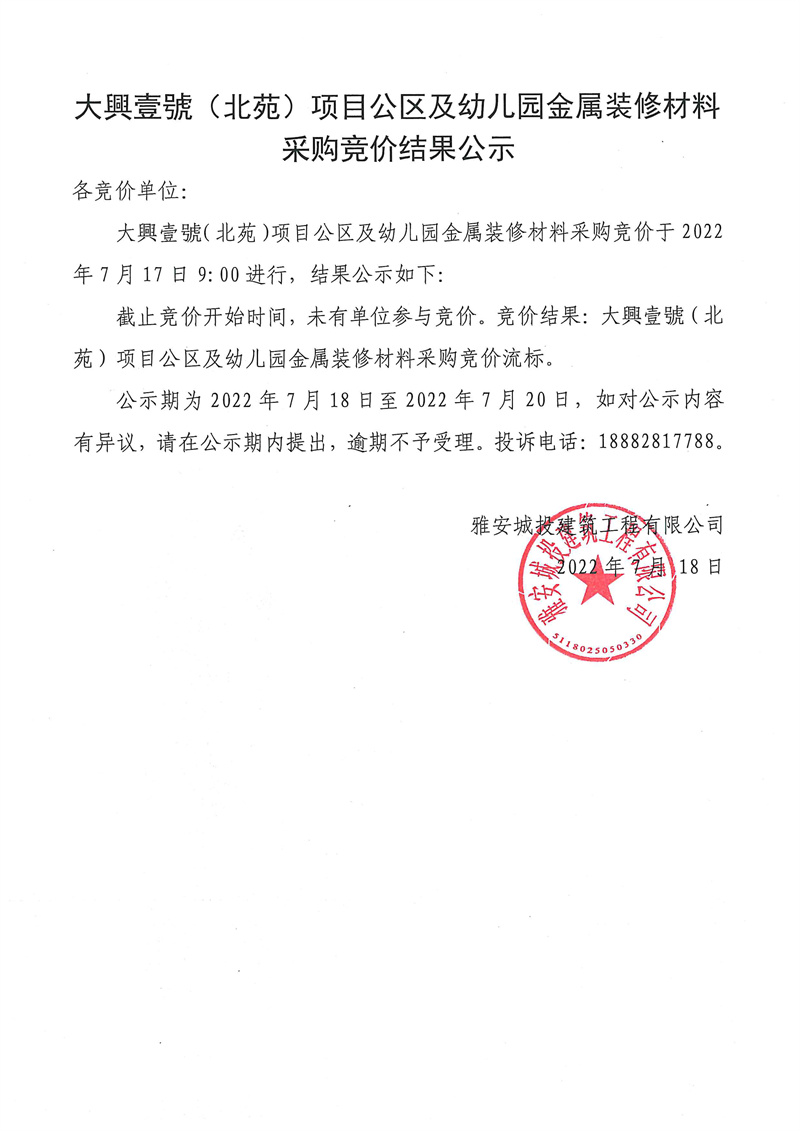 大興壹號(hào)(北苑)項(xiàng)目公區(qū)及幼兒園金屬裝修材料采購(gòu)競(jìng)價(jià)結(jié)果公示