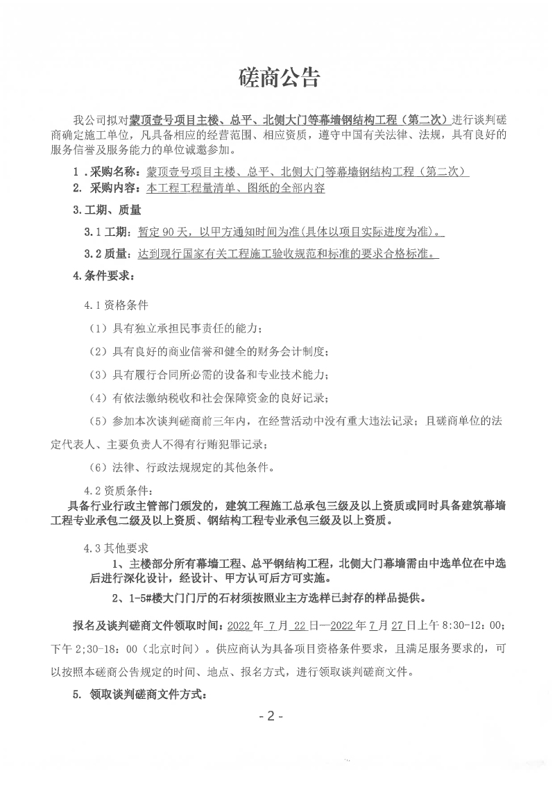 蒙頂壹號(hào)項(xiàng)目主樓、總坪、北側(cè)大門等幕墻鋼結(jié)構(gòu)工程(第二次)談判磋商公告