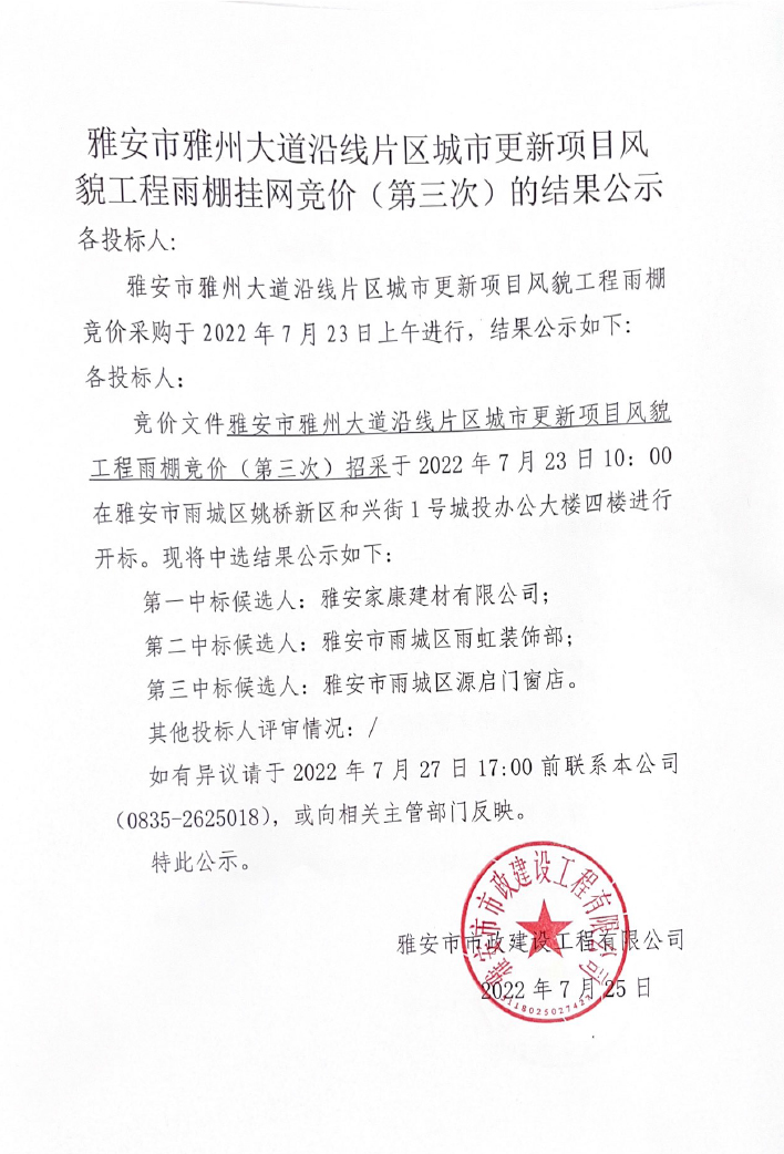 雅安市雅州大道沿線(xiàn)片區(qū)城市更新項(xiàng)目風(fēng)貌工程雨棚競(jìng)價(jià)(第三次)的結(jié)果公示