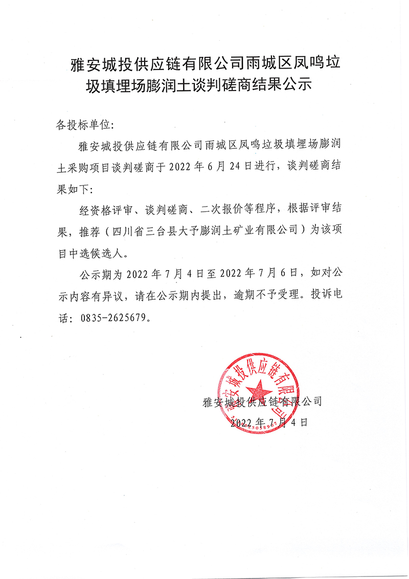雅安城投供應鏈有限公司雨城區(qū)鳳鳴垃圾填埋場封場永久性治理工程項目鈉基膨潤土談判磋商結果公示