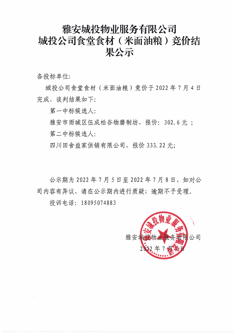 城投公司食堂食材(米面油糧)競價(jià)結(jié)果公示