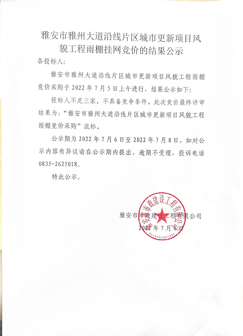 雅安市雅州大道沿線片區(qū)城市更新項(xiàng)目風(fēng)貌工程雨棚競價(jià)結(jié)果公示