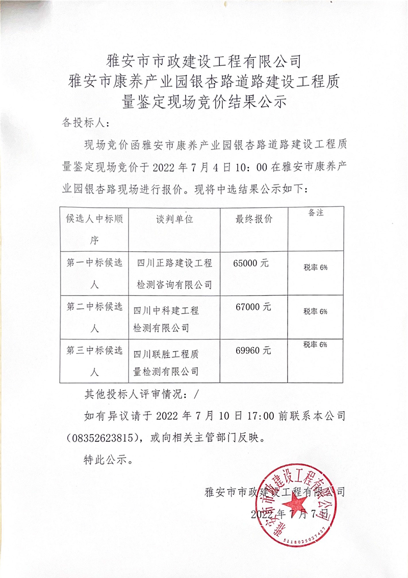 雅安市康養(yǎng)產(chǎn)業(yè)園銀杏路道路建設(shè)工程道路質(zhì)量鑒定現(xiàn)場(chǎng)競(jìng)價(jià)公告