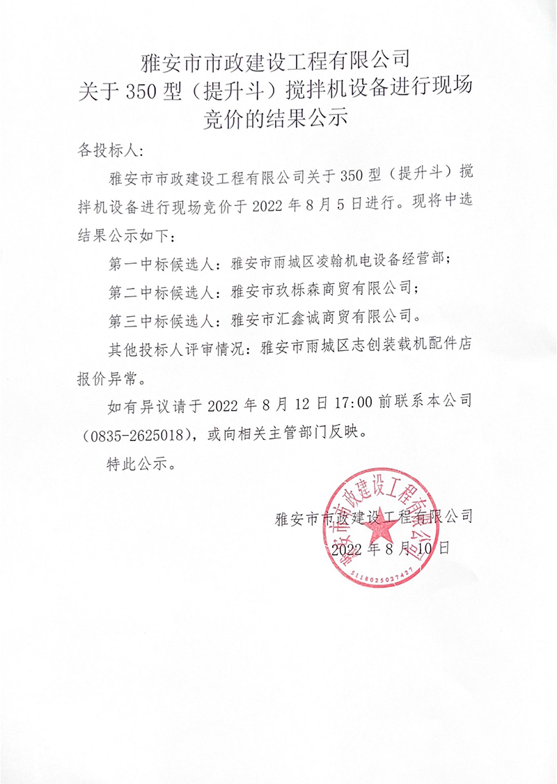 關(guān)于350型(提升斗)攪拌機(jī)設(shè)備進(jìn)行現(xiàn)場競價(jià)的結(jié)果公示