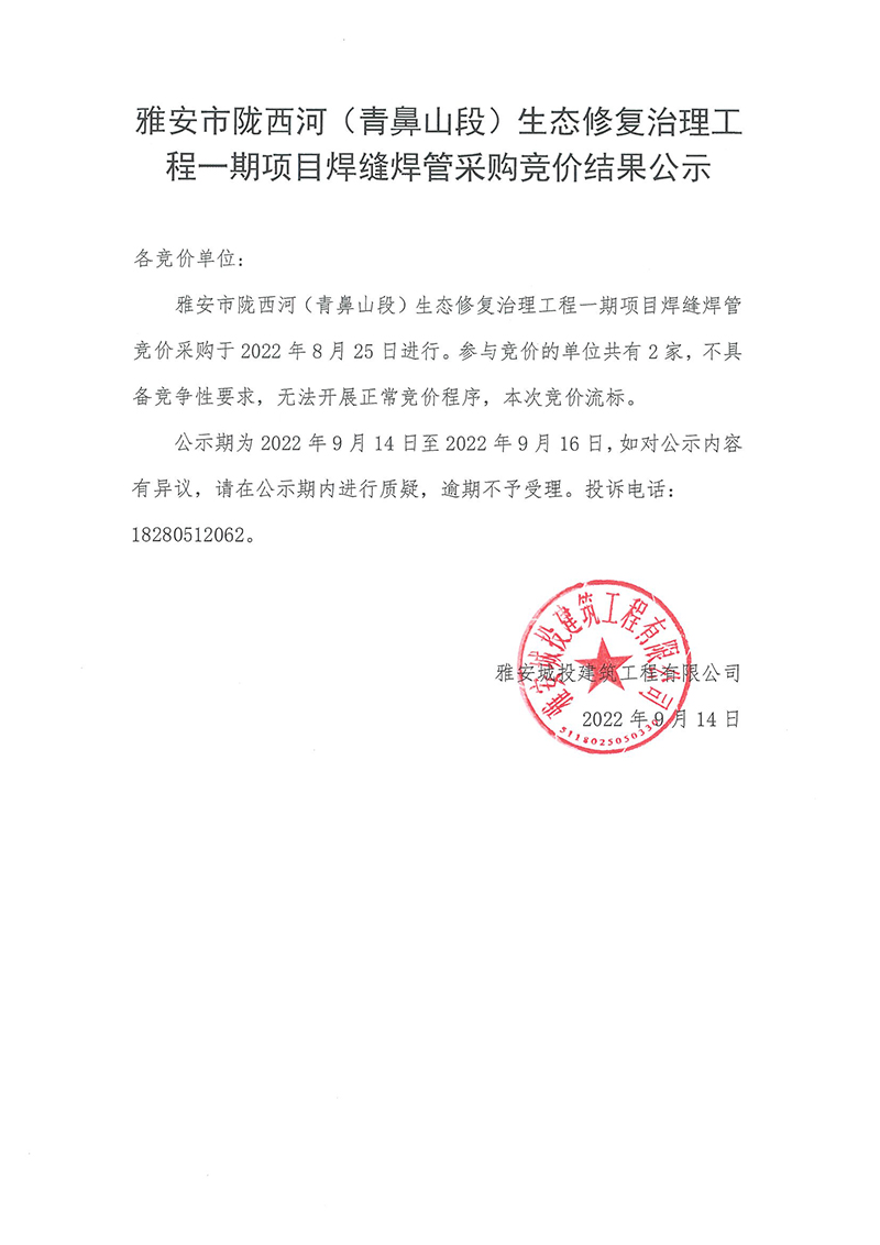 雅安市隴西河(青鼻山段)生態(tài)修復(fù)治理工程一期項(xiàng)目焊縫焊管采購競價(jià)結(jié)果公示