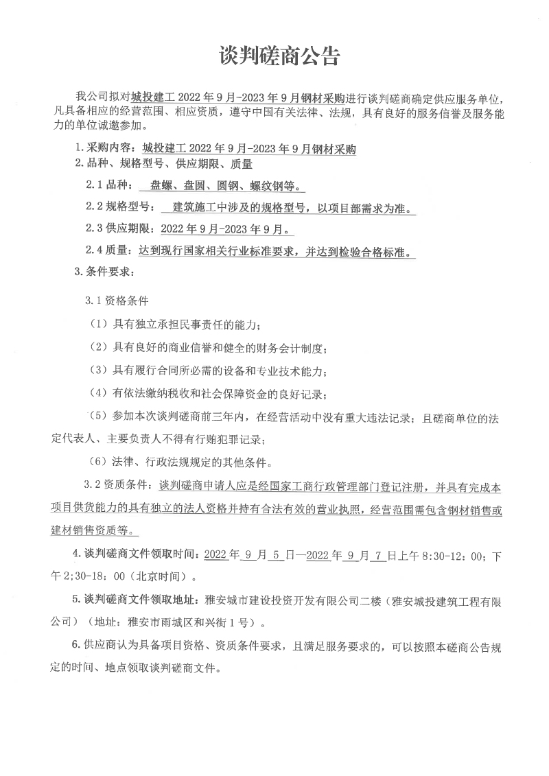 城投建工2022年9月-2023年9月鋼材采購(gòu)談判磋商公告