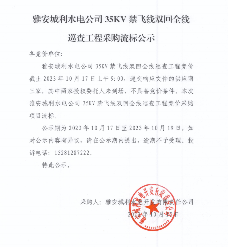 雅安城利水電公司35KV禁飛線雙回全線巡查工程采購(gòu)流標(biāo)公示