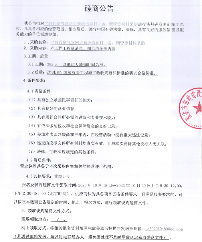 寶興縣燃氣管網更新改造項目井蓋、鋼管等材料采購談判磋商公告
