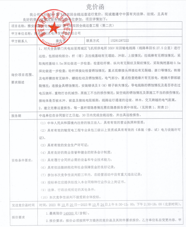 雅安城利水電公司35KV禁飛線雙回全線巡查工程(第二次)競價公告