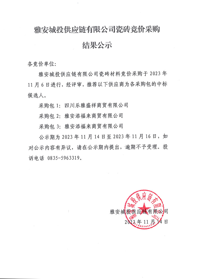 雅安城投供應(yīng)鏈有限公司瓷磚競價采購結(jié)果公示