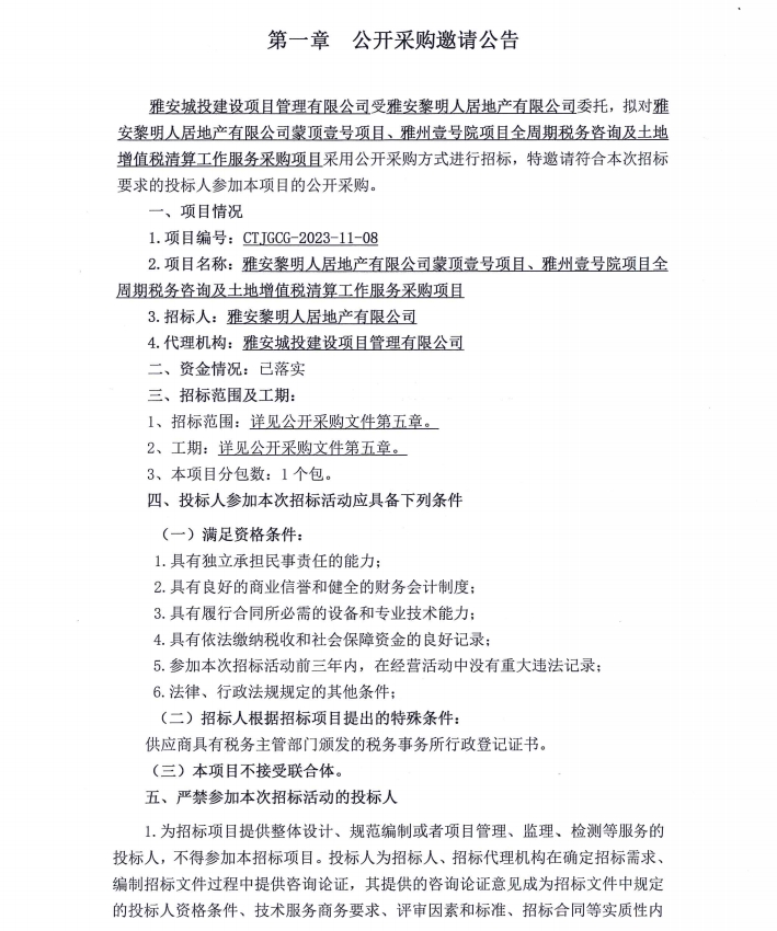 雅安黎明人居地產(chǎn)有限公司蒙頂壹號項目、雅州壹號院項目全周期稅務(wù)咨詢及土地增值稅清算工作服務(wù)采購項目公開采購邀請公告