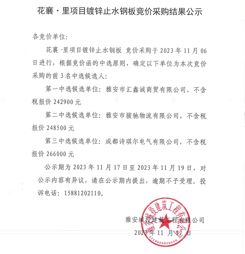 花襄·里項(xiàng)目鍍鋅止水鋼板競(jìng)價(jià)采購(gòu)結(jié)果公示
